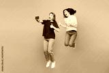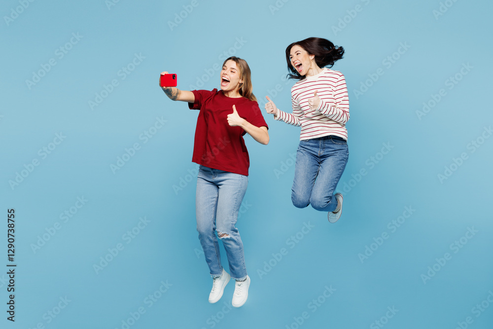Full body young couple two friends women wearing red casual clothes together jump high doing selfie shot on mobile cell phone show thumb up isolated on pastel plain light blue cyan background studio.