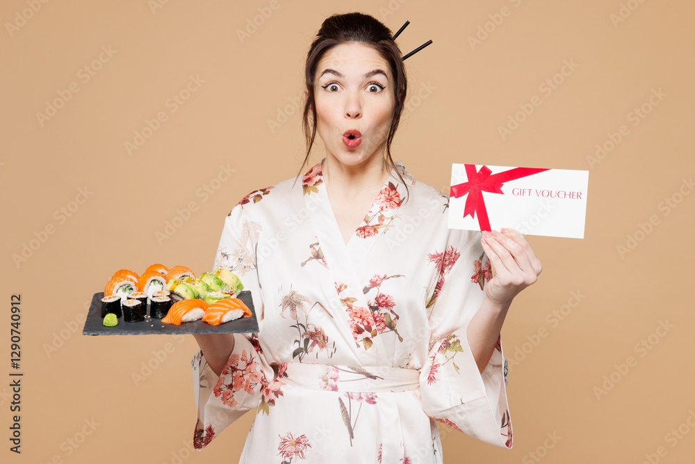 Young surprised woman she wear kimono clothes hold eat raw fresh sushi roll served on black plate gift certificate coupon voucher card isolated on plain beige background studio. Japanese food concept.