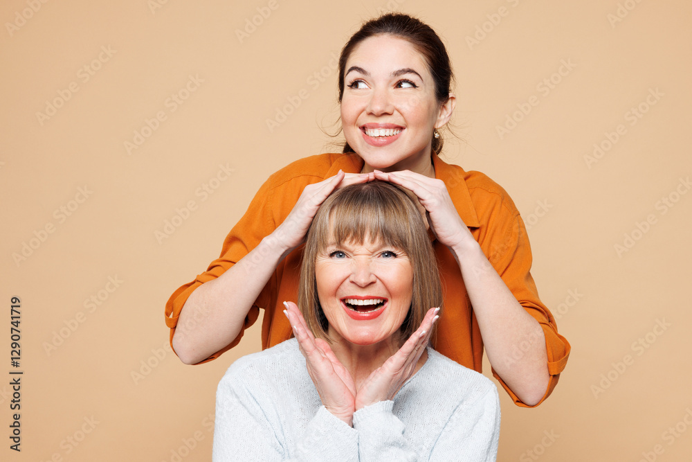 Elder parent mom 50s years old with young adult daughter two women together wear casual clothes stand behind mother put hand on head isolated on plain pastel light beige background Family day concept