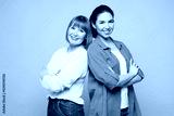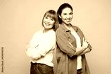 Side view elder parent mom 50s years old with young adult daughter two women together wear casual clothes hold hands crossed folded isolated on plain pastel light beige background. Family day concept.