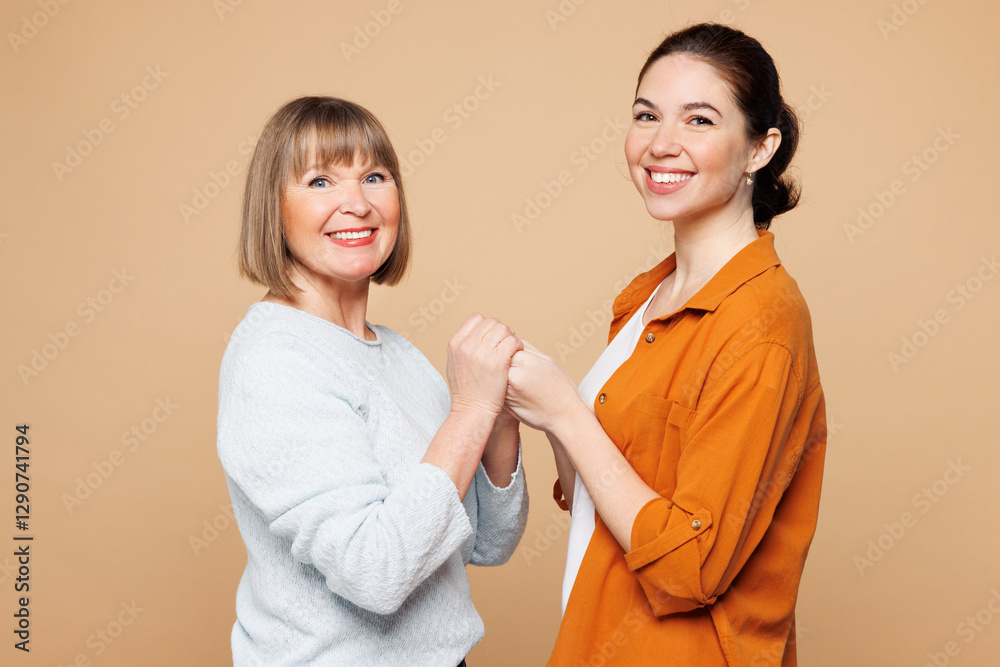 Elder parent mom 50s years old with young adult daughter two women together wear casual clothes hug embrace hold hands look camera isolated on plain pastel light beige background. Family day concept.