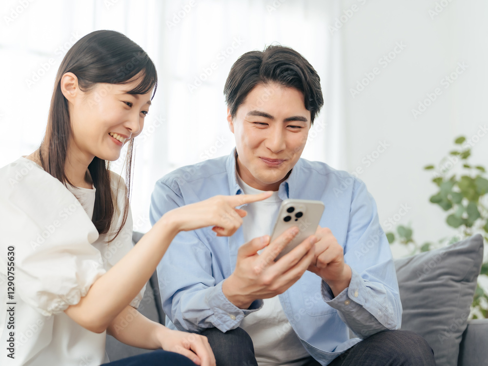 スマホ、カップル、夫婦、笑顔、アプリ、SNS、動画、ポジティブ、キャンペーン、ポイント、セール、ネットショッピング、通販、検索、オンライン、スマートフォン、楽しい、嬉しい、ソーシャルメディア、ゲーム、相談、若い、男性、女性、日本人、リビングルーム、室内、リラックス、くつろぐ、通信、インターネット、web、フリマ、オークション、ネット、予約、メール、結婚、マッチング、教える、会話、DX、IoT、IT