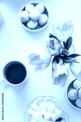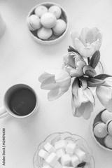 Spring background. Sweets and tea on a table with pink tulips. Still life with fresh bouquet of tulips. Beautifully decorated tray with a bouquet of tulips and a Cup of tea.