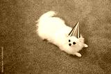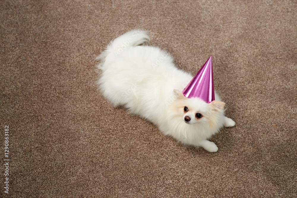 Pomeranian dog wearing a pink party hat, standing on carpet with curious expression against neutral background, dog captures attention with cute appearance and vibrant hat