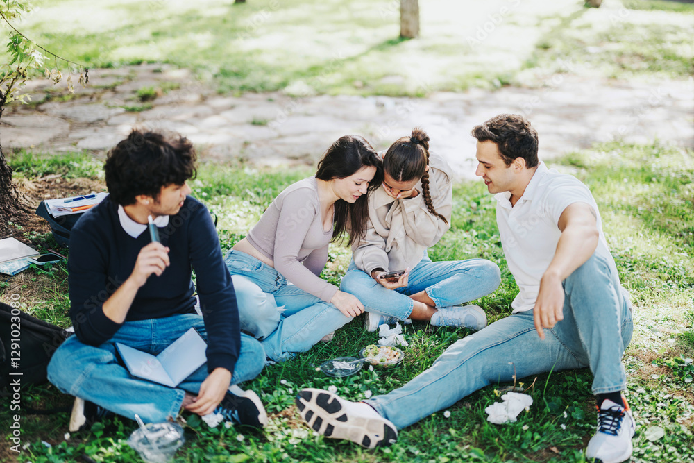 Young students sitting on grass, engaging in a lively conversation and enjoying leisure time together. The setting is lush and green, reflecting a relaxed and friendly atmosphere.