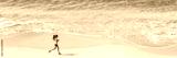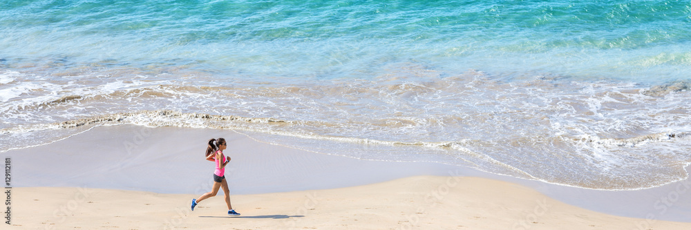 Woman runner training cardio running by the ocean on the beach. Morning workout. Panorama horizontal banner crop for copyspace.