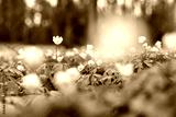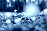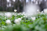 Vibrant white wood anemone blossoms in a sunlit spring forest. Wildflower-covered meadow scenery