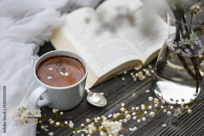 Spring background with cup of hot chocolate cacao, old book and wild cherry flowers on wooden table. Reading concept