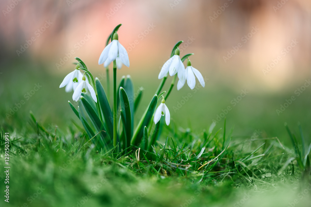 Snowdrop flowers on spring meadow forest closeup. Macro nature photography