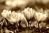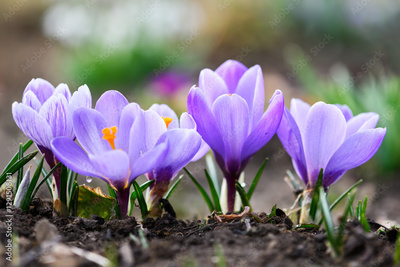 Purple crocus flowers on green meadow closeup. Sunny spring forest on background. Nature photography