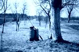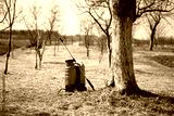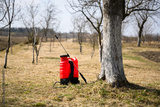 Garden sprayer in vibrant red color placed in a spring garden. Agricultural tool for plant care