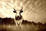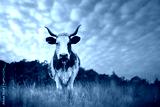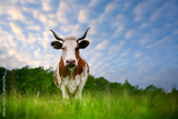 Brown and white cow grazing on lush green grass on spring field on blue sky background