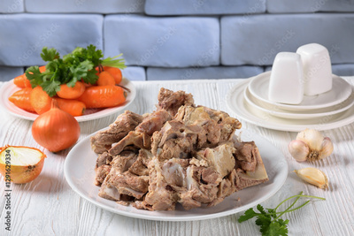 pork and beef bones with leftover meat after cooking broth on a white plate with carrot, garlic, onion and spices at the background of brick wall, horizontal view from above, close-up