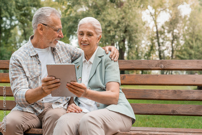 Smiling senior active couple sitting on the bench looking at tablet computer sharing a pad , smiling and enjoying a peaceful sunny day outdoors.. Using modern technology by elderly people.