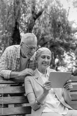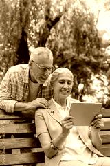 Vertical shot of happy smiling senior couple using digital tablet pad gadget device computer. Using modern technology by elderly people. Retirement warm family lifestyle concept.