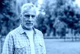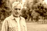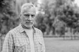 A portrait of a senior man with gray hair and a beard standing in park. He wears a casual plaid shirt over a white t-shirt. The background is blurred with green trees. He looks confident and relaxed.