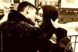 A black and white photograph showing a couple standing close to each other on the street. The man gently holds the woman's head and they look at each other with love.