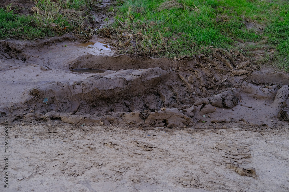 Muddy road with deep vehicle tracks after heavy rain and melting snow, Deep tire tracks in wet, muddy slush, Muddy terrain with tire impressions, challenges of off-road environments