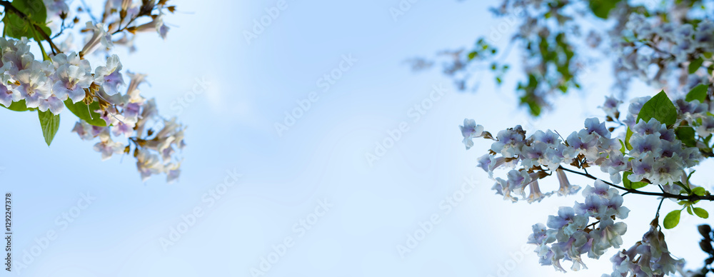Close-up delicate white Blooming Paulownia tomentosa blossoms. Fresh spring flowers. Perfect for spring themes and backgrounds, for web design and advertising