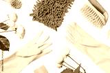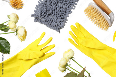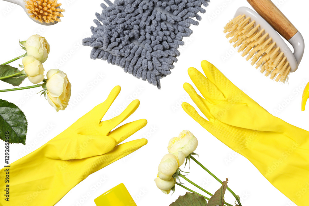 Spring cleaning, cleaning equipment and flowers, isolated on white background, PNG