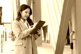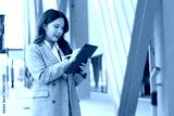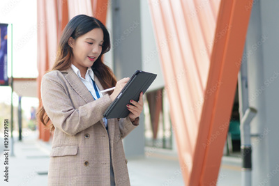 Asian businesswoman working on a tablet while standing outside a modern office building