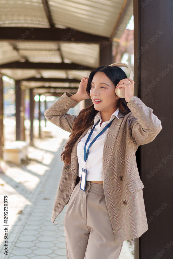Young Asian businesswoman putting on wireless headphones and enjoying music in an outdoor walkway