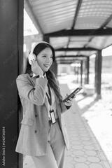 Young Asian businesswoman putting on wireless headphones and enjoying music in an outdoor walkway