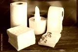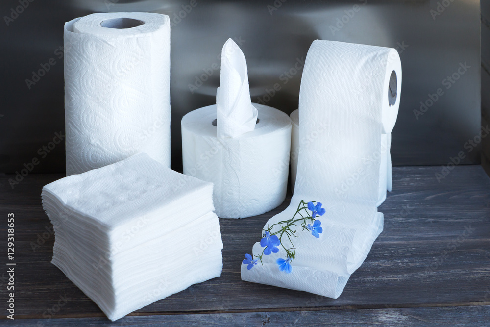 Paper towel, toilet paper, paper tissue and napkins on wooden board, Concept of cleanliness and body care.