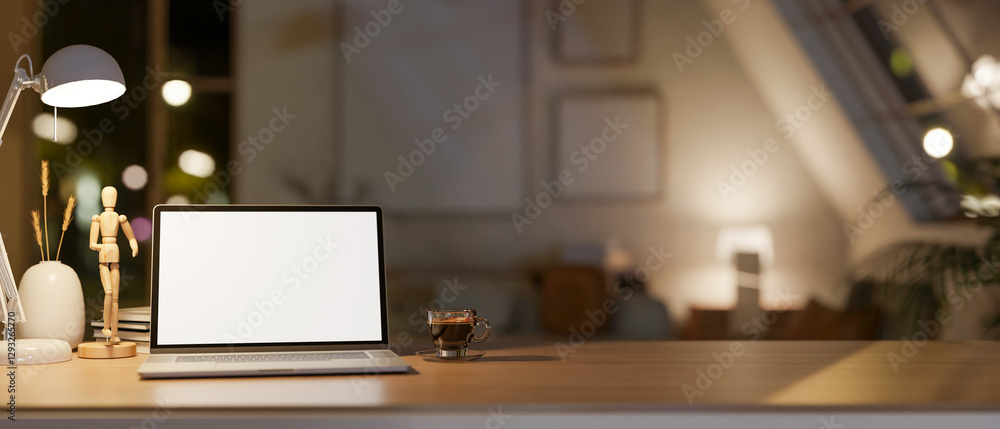 A white screen laptop on the wooden table in lamp light, with the blurred background of dim light room.