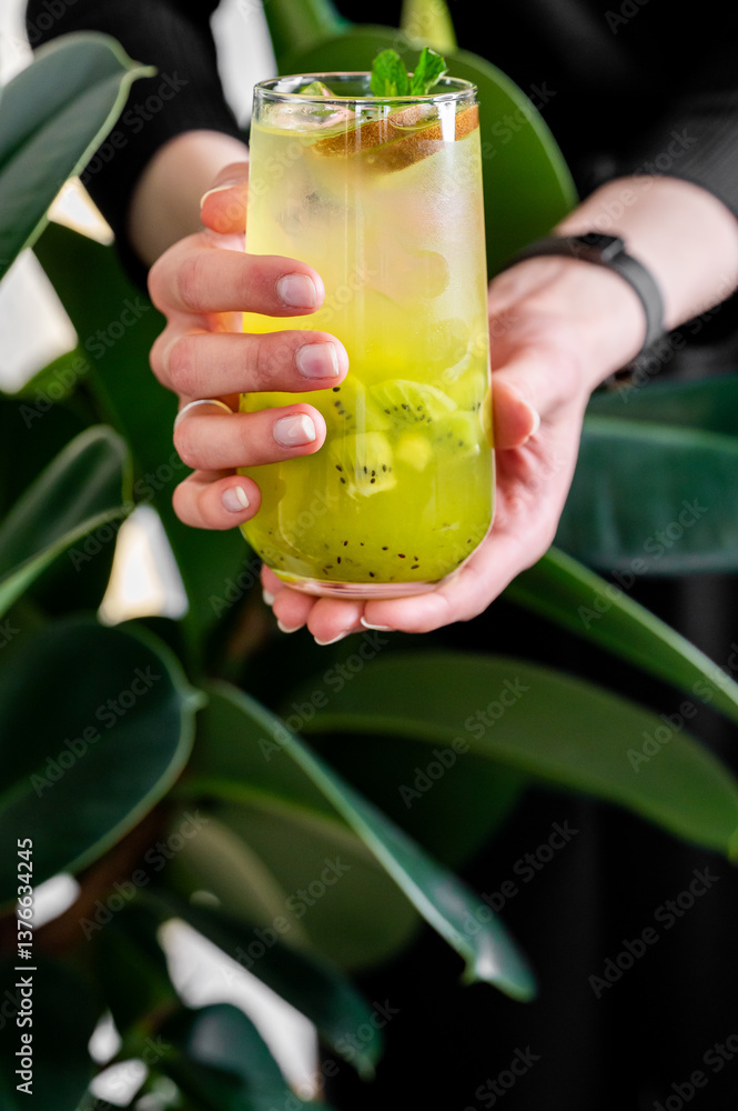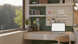 A white screen laptop on the wooden desk with stationary set and decors beside the large window.