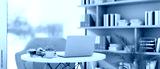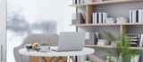 Back view of a white laptop on round table with decors beside the large wall window and wooden shelf.