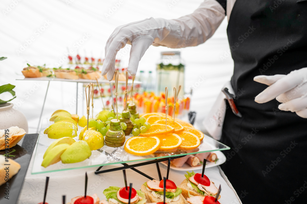A catered event featuring an elegant display of appetizers, including fresh fruit, mini sandwiches, and garnishes, served on a glass platter by a gloved server.