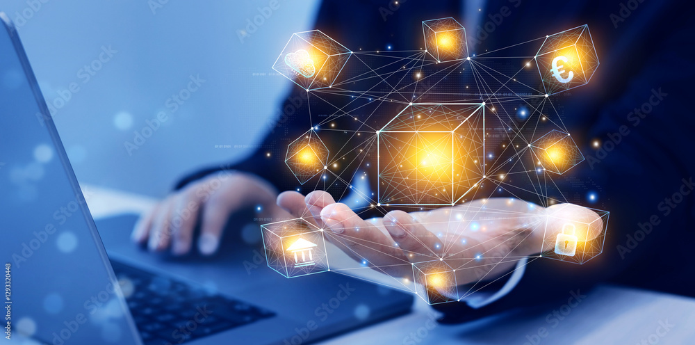 Blockchain technology.Blockchain technology transactions and digital currency.Businessman touching futuristic blockchain data network.Management data of digital decentralized transaction and immutable