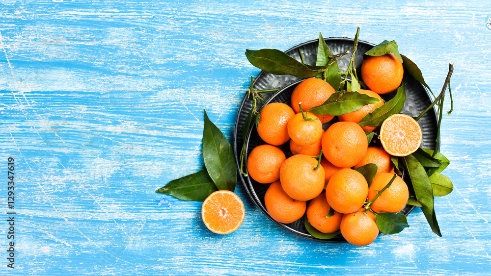 Set of fresh orange mandarins and green leaves on a blue background. Close-up.