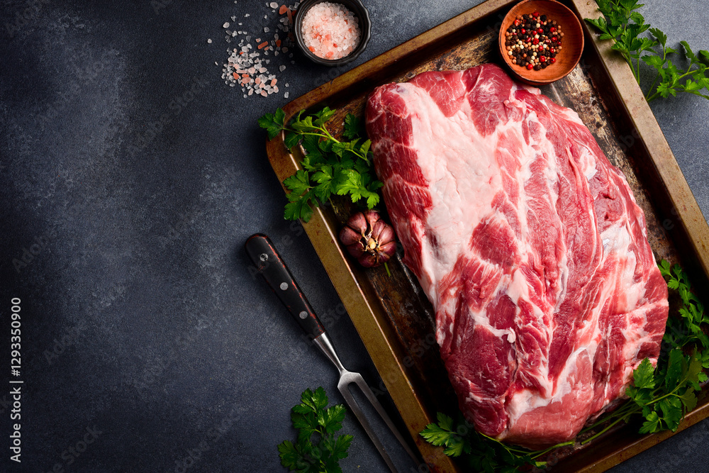 Raw meat: pork neck on a metal tray, ready to cook. Close up, meat texture.