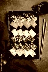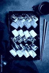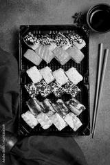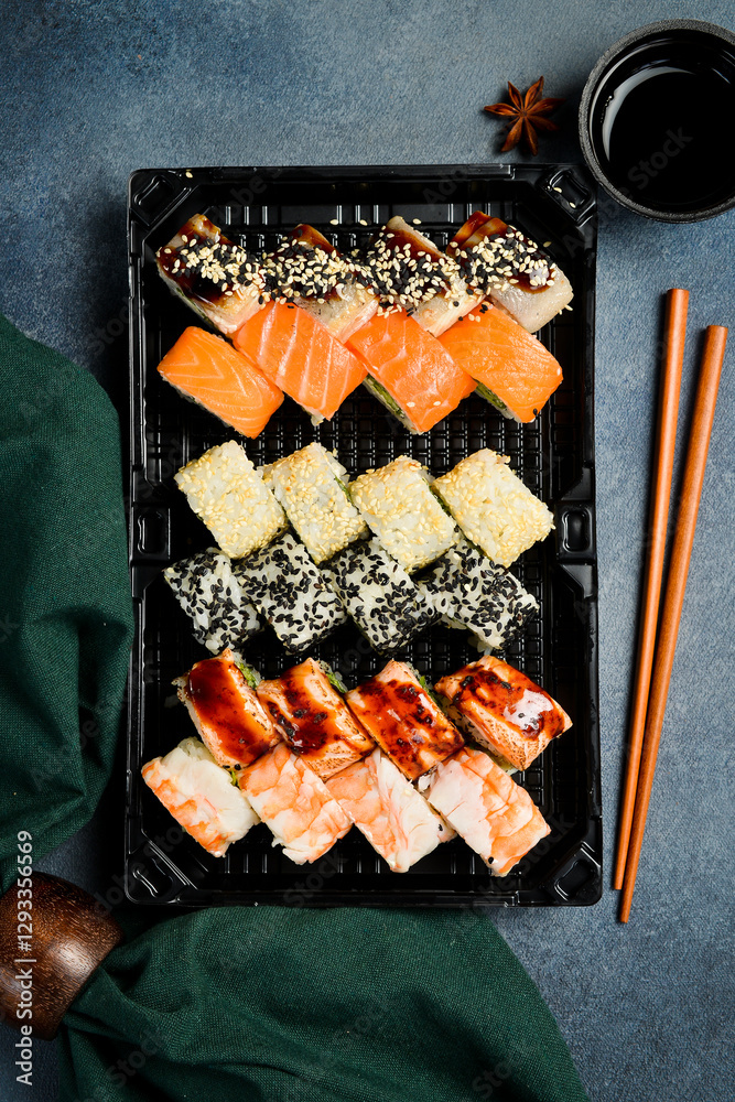 A set of sushi and rolls. Japanese food. Food delivery. On a dark stone background.