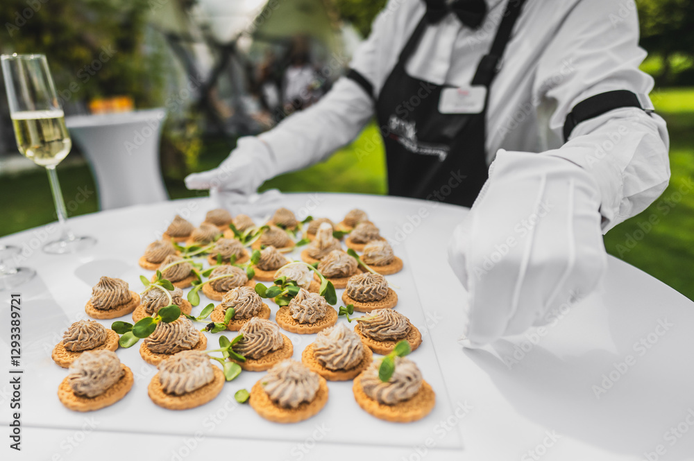 A well-dressed waiter serves elegant canapés on a white table outdoors. The sophisticated hors d'oeuvres feature a creamy topping and are garnished with fresh herbs, accompanied by champagne