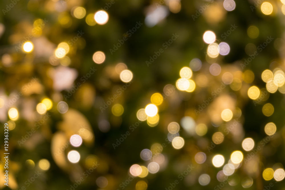 christmas tree bokeh light in green yellow golden color, holiday abstract background, blur defocused