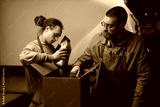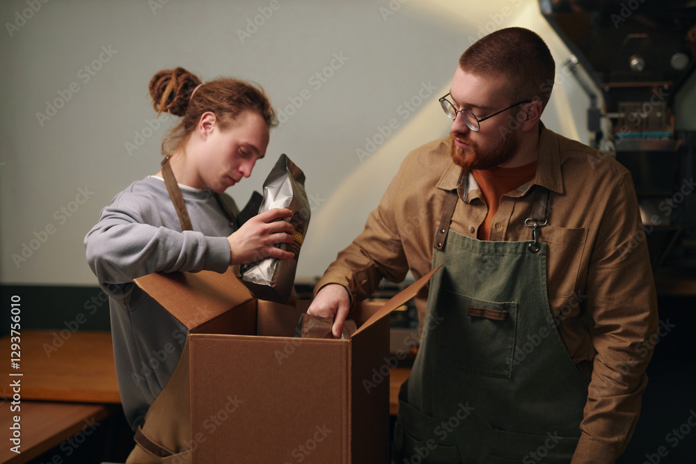 Medium close up of Caucasian factory workers packing foil bags into cardboard box together to deliver them to store