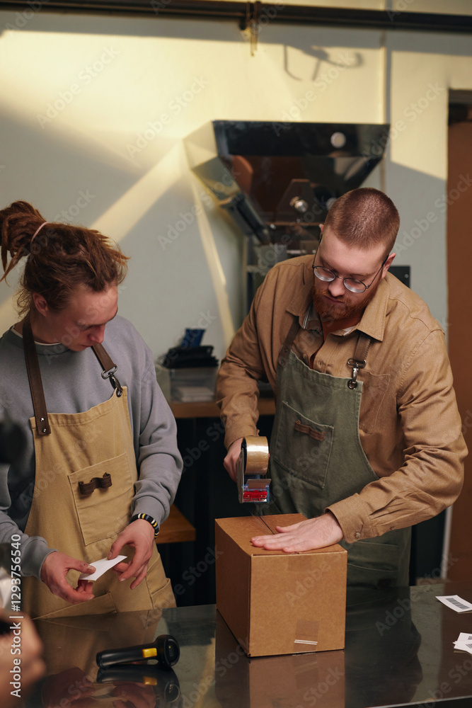 Vertical of two Caucasian workers packing cardboard box with sticky tape and putting label on it