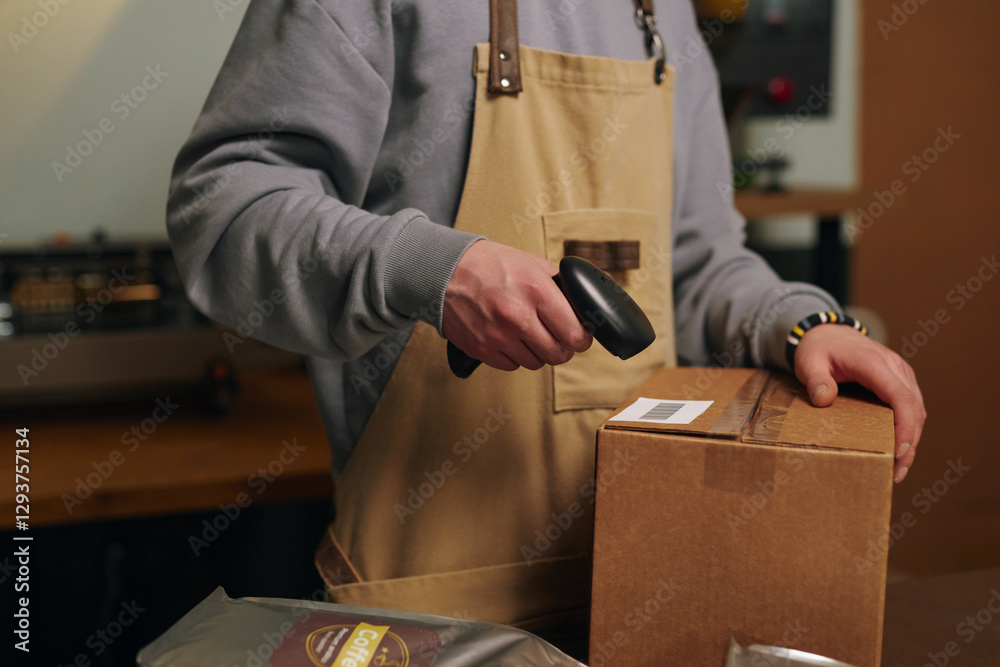 Medium close up of unrecognizable factory worker scanning barcode on cardboard box