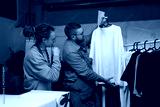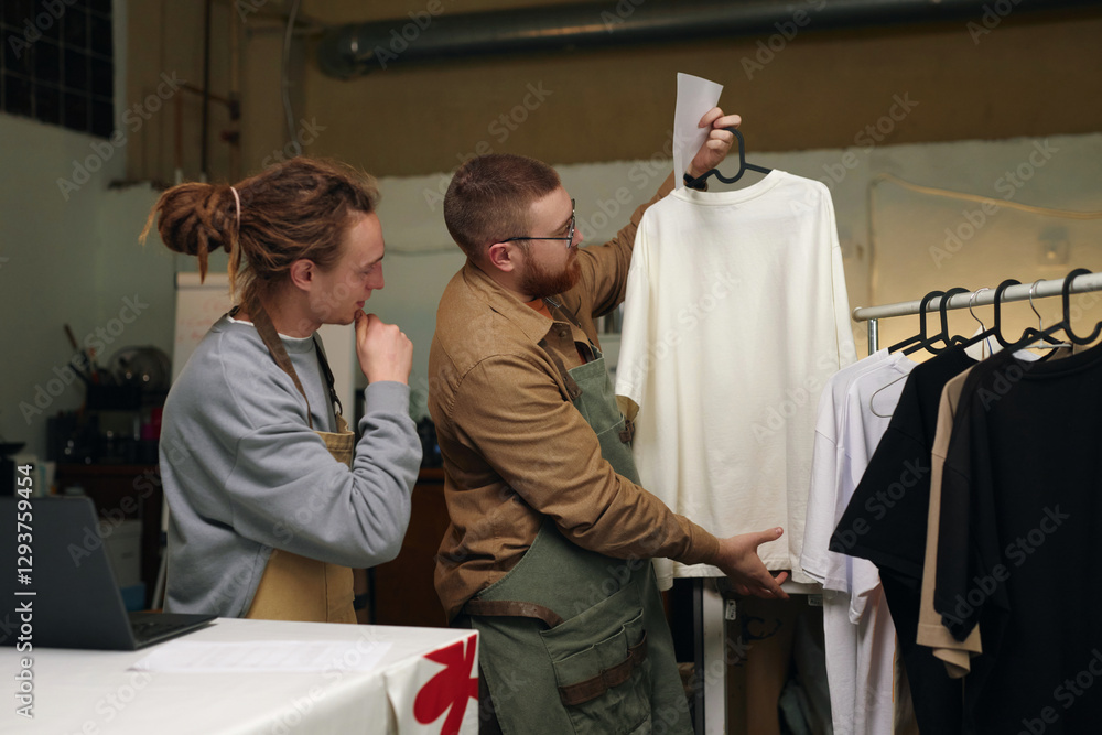 Wide shot of talented and creative young adult businessmen discussing design of t-shirt to sell them in own cafe