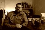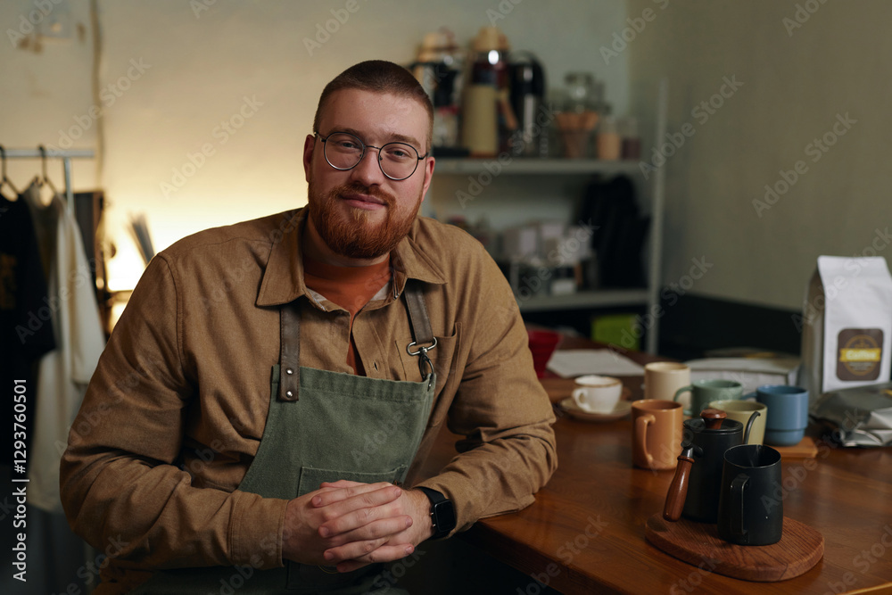 Medium close up portrait of Caucasian young adult entrepreneur smiling while sitting at table with handmade cups for coffee