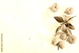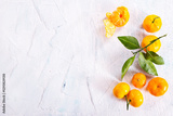 Orange fruit with green leaves on the white wood.