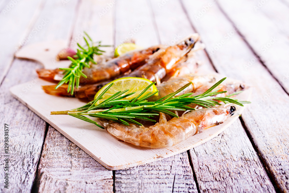 Uncooked Raw peeled tiger white shrimp prawn. Top view.
