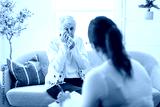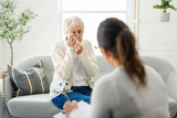 old woman thinking with psychologist in consultation office for mind, evaluation or assessment.