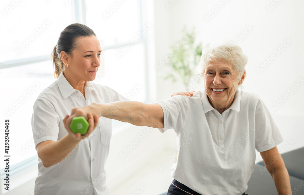physiotherapist helping senior woman in clinic. Elderly woman undergoing physiotherapy treatment for injury