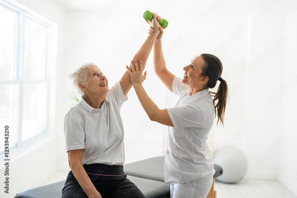 physiotherapist helping senior woman in clinic. Elderly woman undergoing physiotherapy treatment for injury