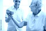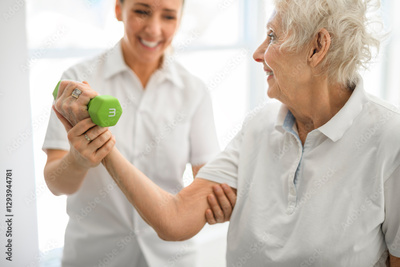 physiotherapist helping senior woman in clinic. Elderly woman undergoing physiotherapy treatment for injury