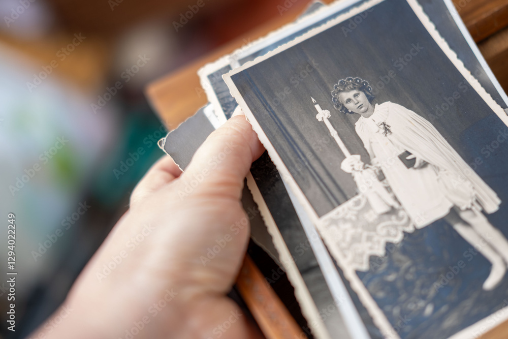 Close-up female hands holding vintage black and white photos, reminiscing about family history and forgotten moments, Sorting through old photographs, historic archive, concept genealogy, family tree